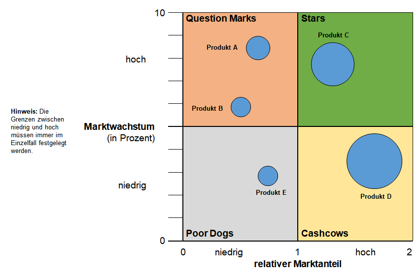 Produkt Rel. Marktanteil Marktwachstum Umsatz A 1,4 % 18 % 200.000 B 1,6 % 8 % 250.000 C 1,2 % 6 % 200.000 D 1,6 % 4 % 100.000 E 0,8 % 5 % 100.000 F 0,5 % 2 % 200.000 a) Trage die Produkte in die BCG-Matrix ein. Jedes Produkt wird durch einen Kreis dargestellt. Die Größe der Kreise soll den jeweiligen Umsatz symbolisieren.