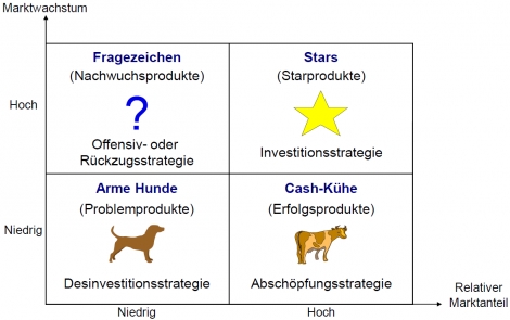 - Die daraus entstehende Matrix ist in vier Felder aufgeteilt. Jedes Feld entspricht einem strategischen Geschäftsfeld und verlangt unterschiedliche Handlungen durch das Management (=Normstrategien).